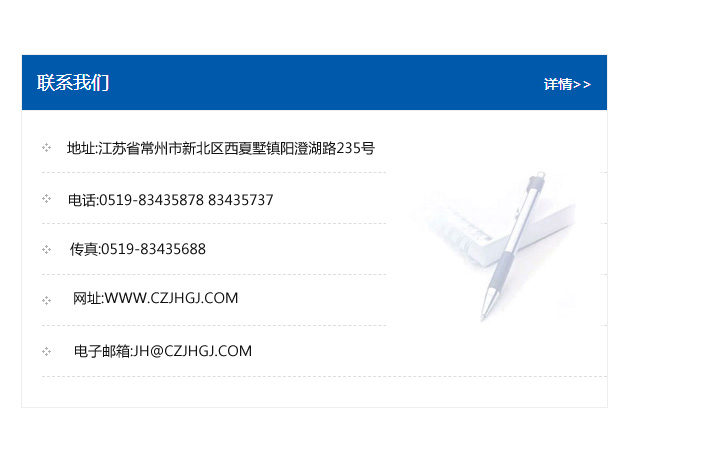 傳真:0519-83435688    郵編:213135    網址:WWW.czjhgj_com.cjzmchina.com    電子郵箱:JH@czjhgj_com.cjzmchina.com